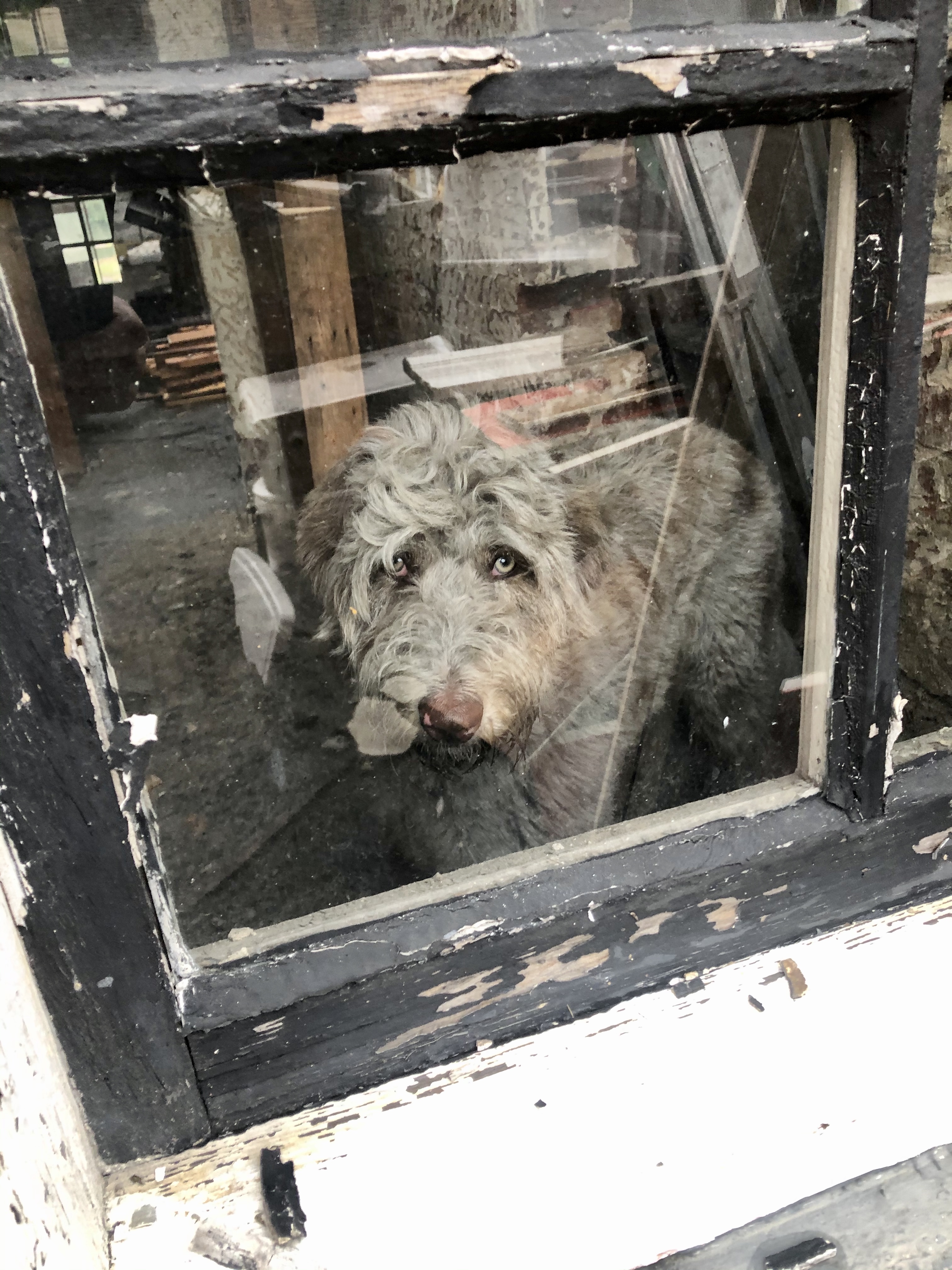 It is hard, dirty work. Coal has been used to heat all of these buildings for over a century, leaving a thick coating of black soot in the ceilings which, when removed, rains down on everything and sticks to sweaty skin. The dog’s fur color has greyed.