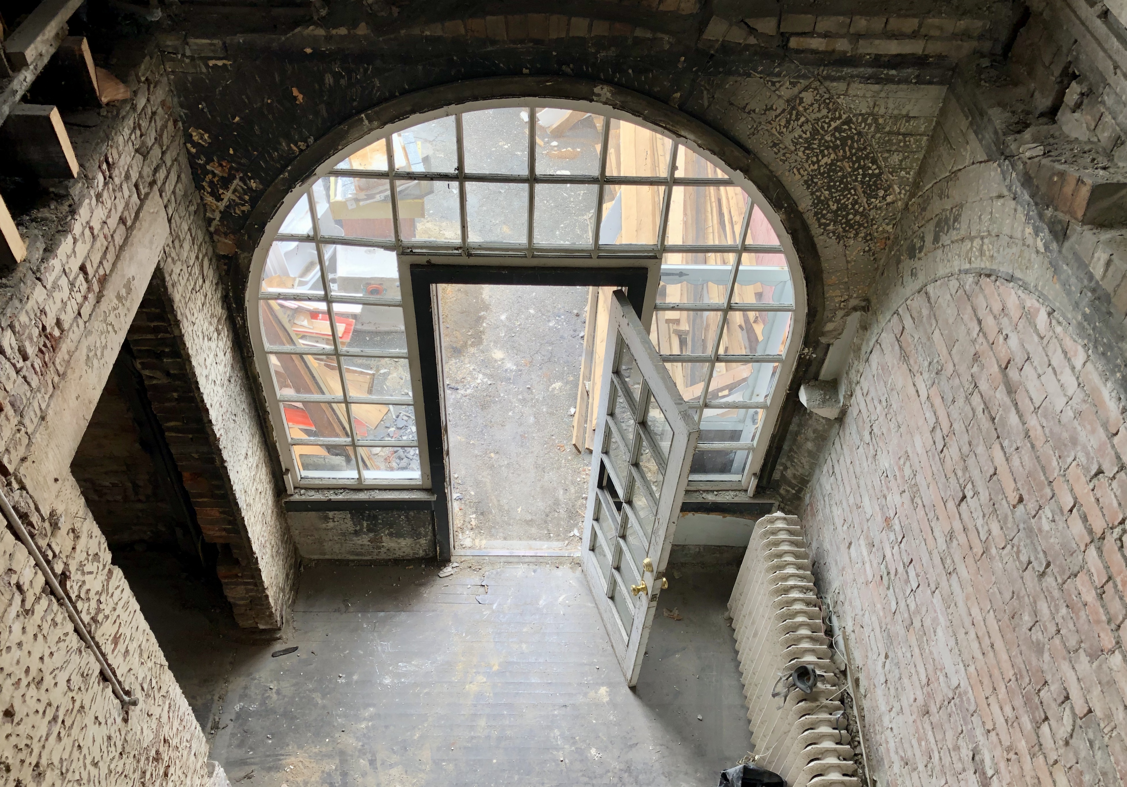 Rather than re-plastering and painting, all of the lath and plaster is now down; most of the non-load-bearing “stick”/framed walls are too. This has revealed not only a brick house on the exterior, two courses deep, but also on the interior. She is opening up ceilings and cutting out some floors creating a clerestory. Already the rectory bears no resemblance to its erstwhile rigid formality nor its recent history as a slumlord’s ready cash source.