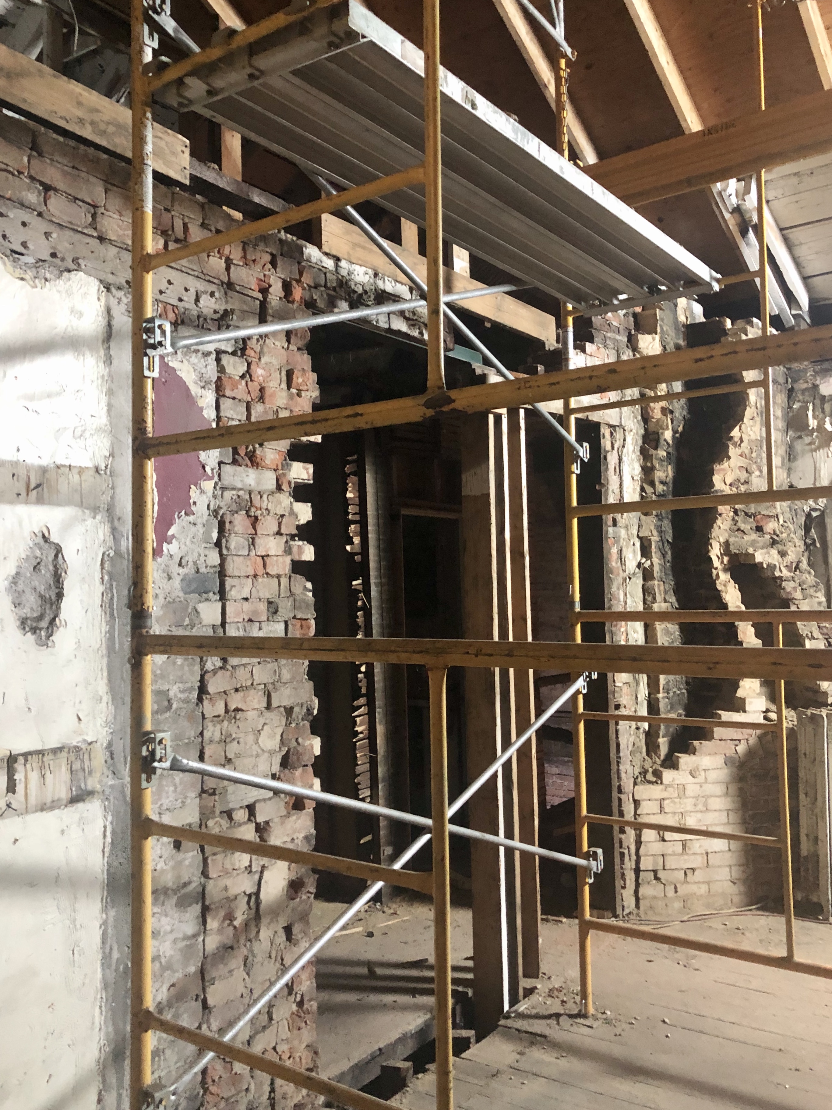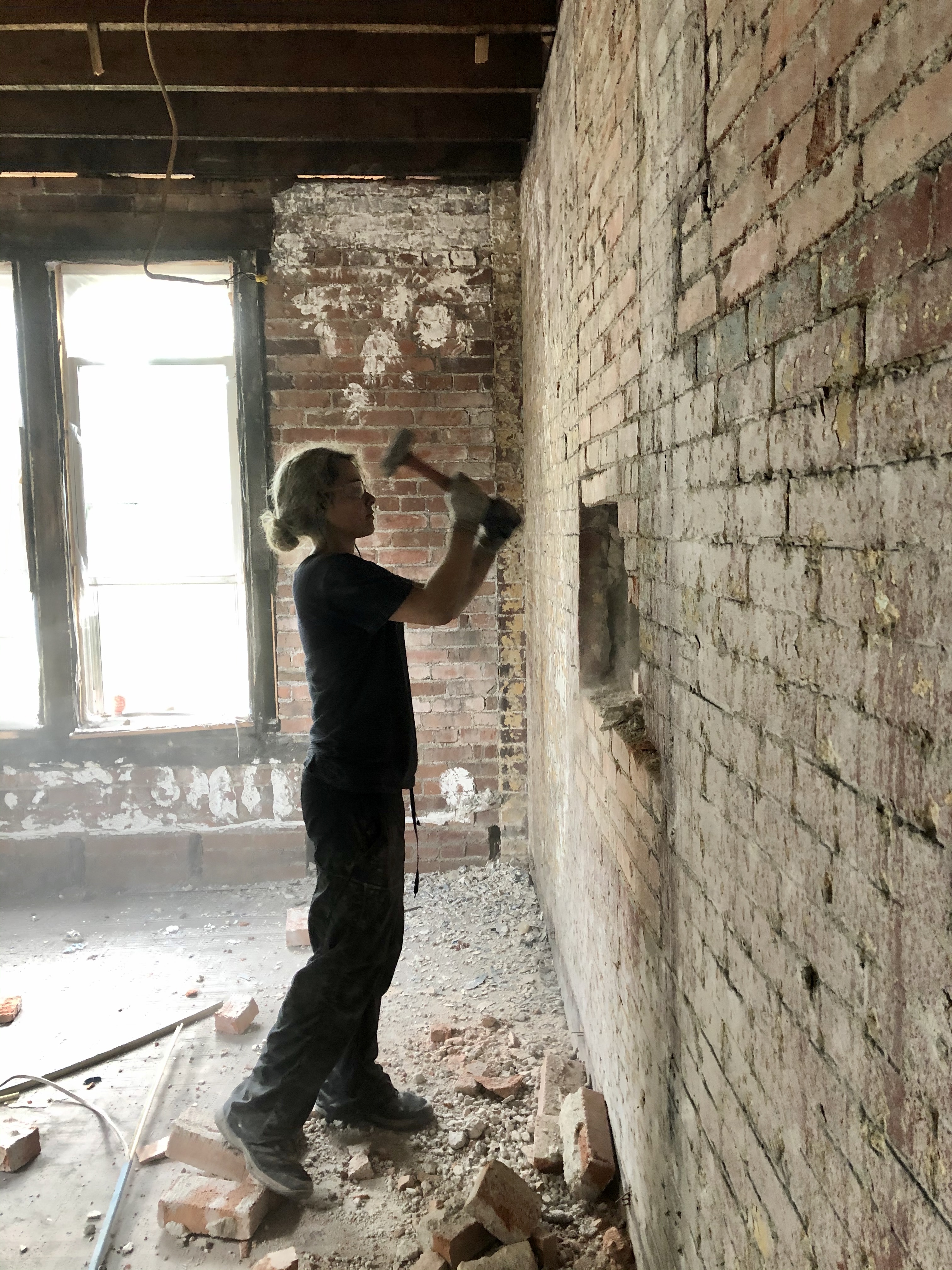 There is brick in abundance as she clears old closed windows to the meaty wood headers, or as they put in angle irons to support the less meaty lumber and bring in more light.