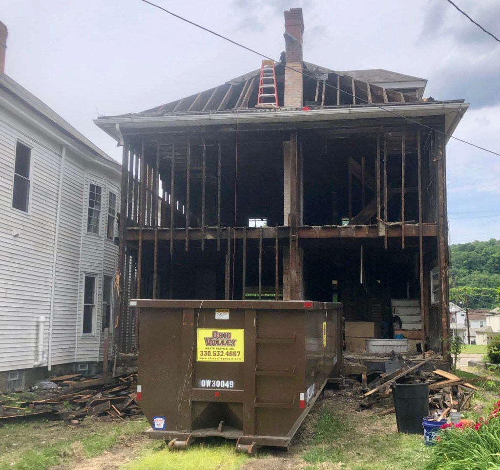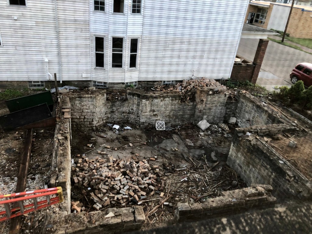 If you were to create a square out of the land and three buildings in our project, until a few weeks ago, you would have seen a fourth structure in the northwest quadrant. A house overcome with weeds climbing into windows, electrical lines clipped, siding rotting away revealing a previous layer of siding it once attempted to cover. The back door window glass shattered. A broken chair. A faux fireplace covered in coal-and-dirt-blackened fake flowers. Small white plastic packets the size of postage stamps scattering the porch amidst the broken glass. A container of cleaning fluid off to the side. Wrought iron posts pushing down through rotting wood.