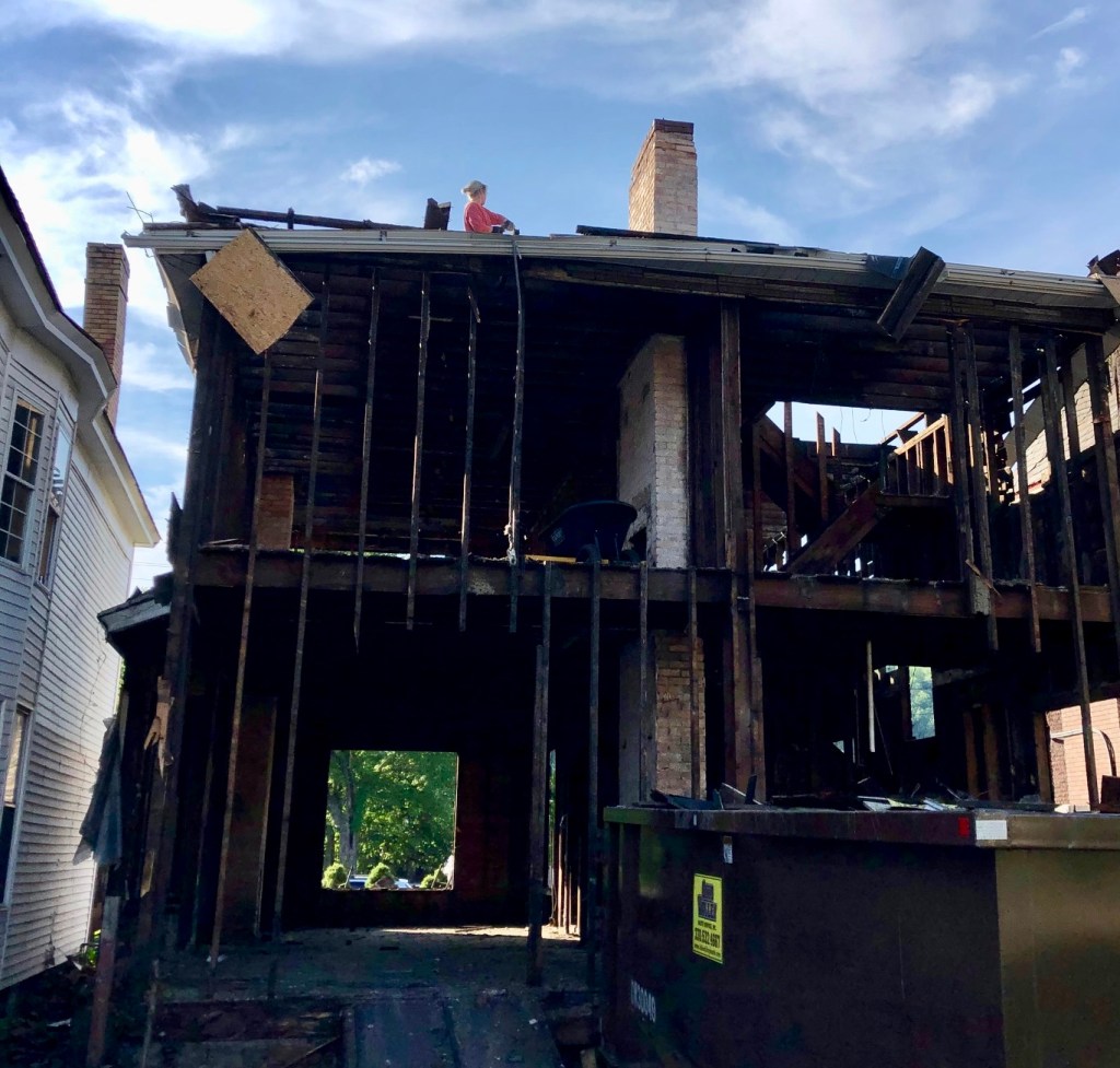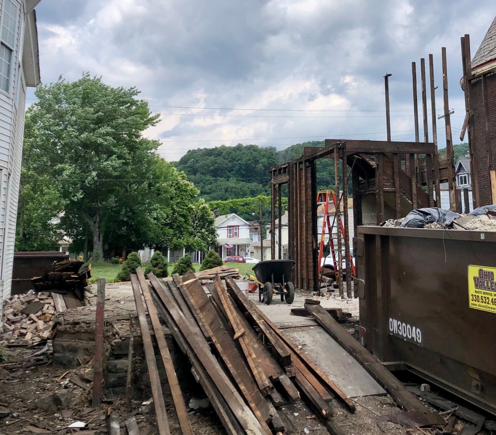 She works from dawn to past dark, often covered in coal dust, first-generation insulation, and god knows what else. The piles of lumber outside increase. The rotting house shrinks. Dumpsters come and go—one in front and one in back. Occasionally I help load them. Or hold a larger window as she cuts around it. Or catch the beams and joists as she lowers them on a rope to the back yard. Or cart some flooring into the church for safe keeping.