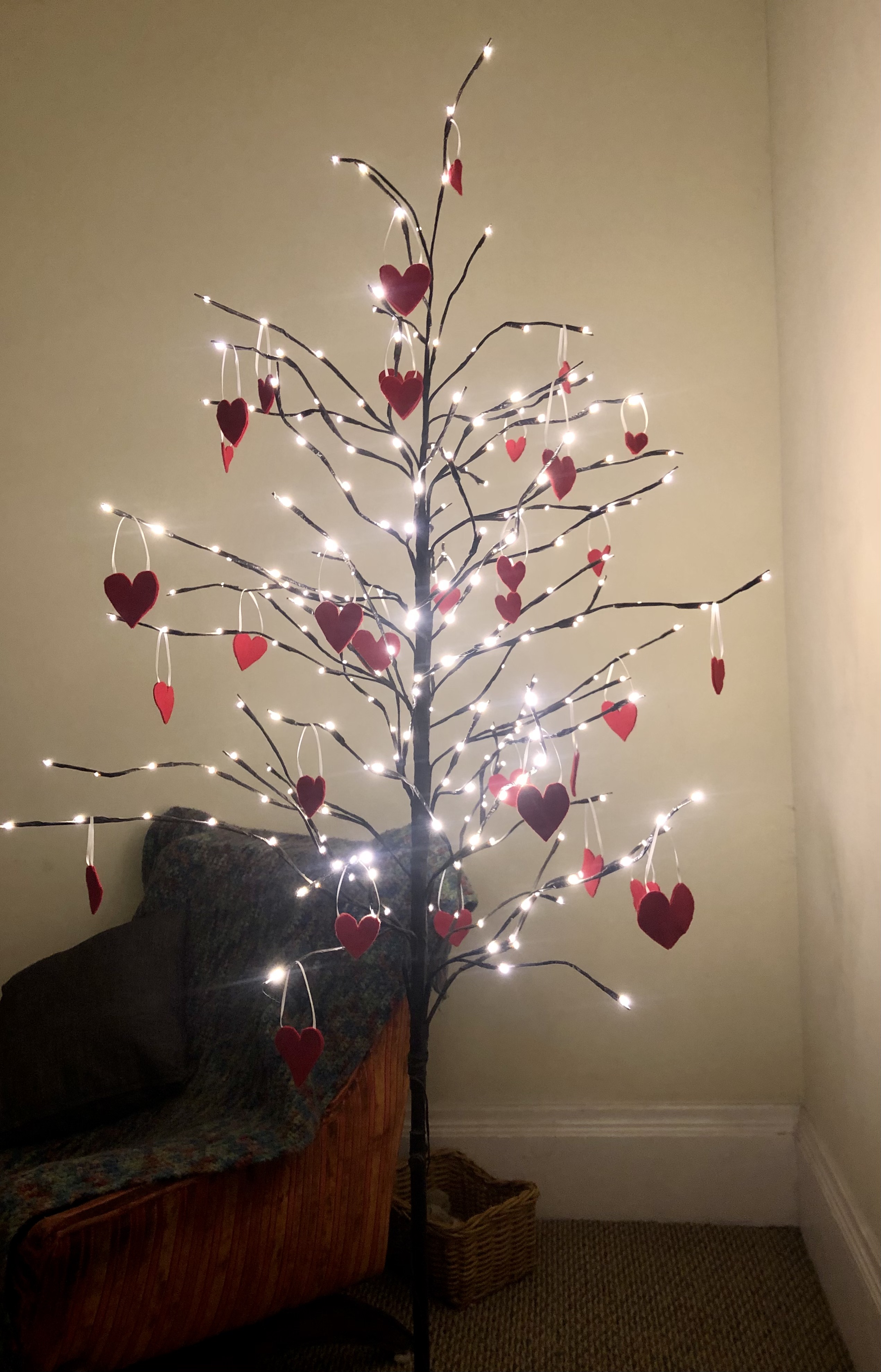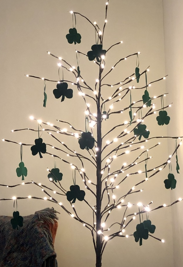 Soon it will be St Patrick’s. Maybe I will put shamrocks on her branches. (Green felt, ribbon)