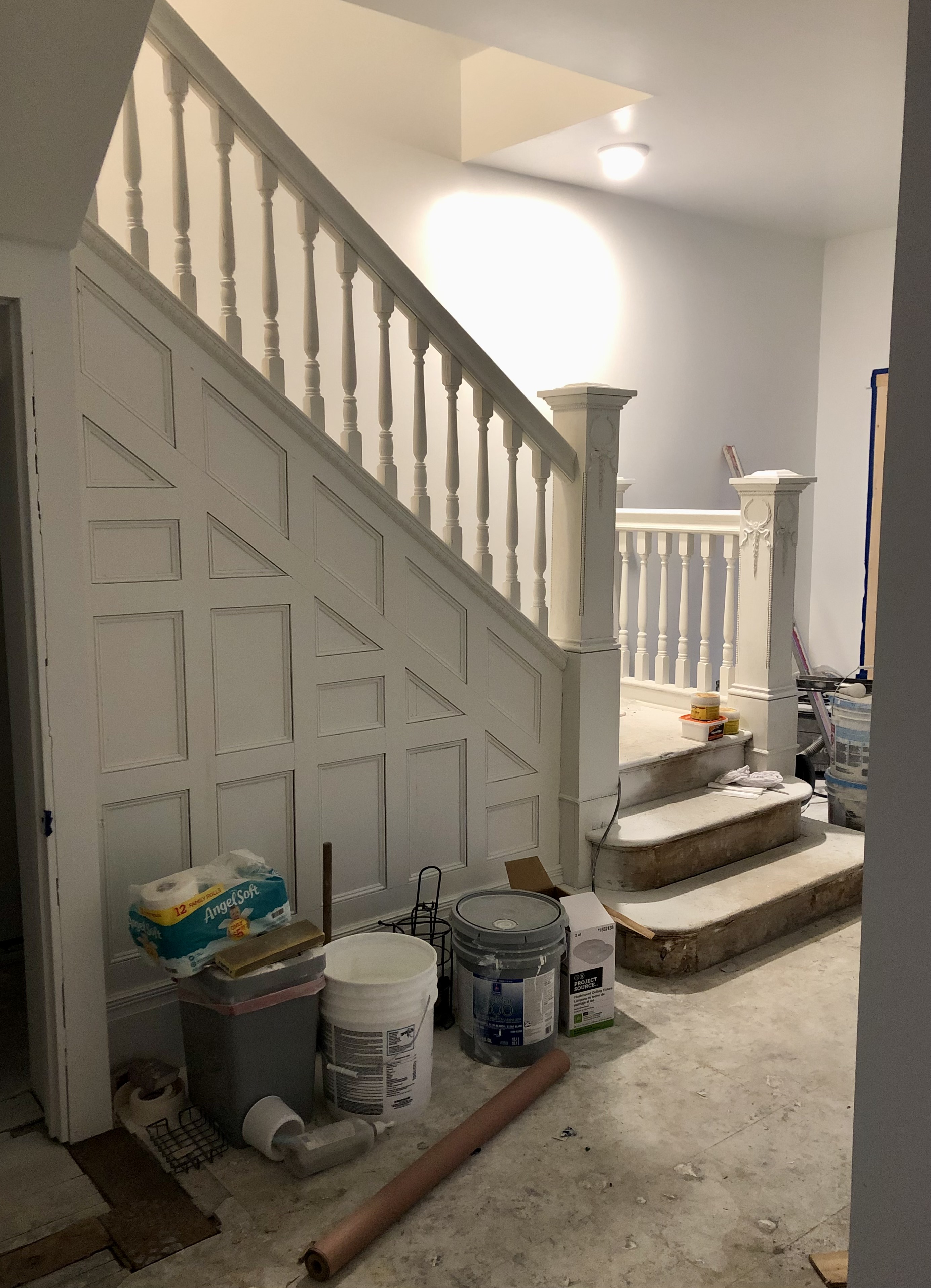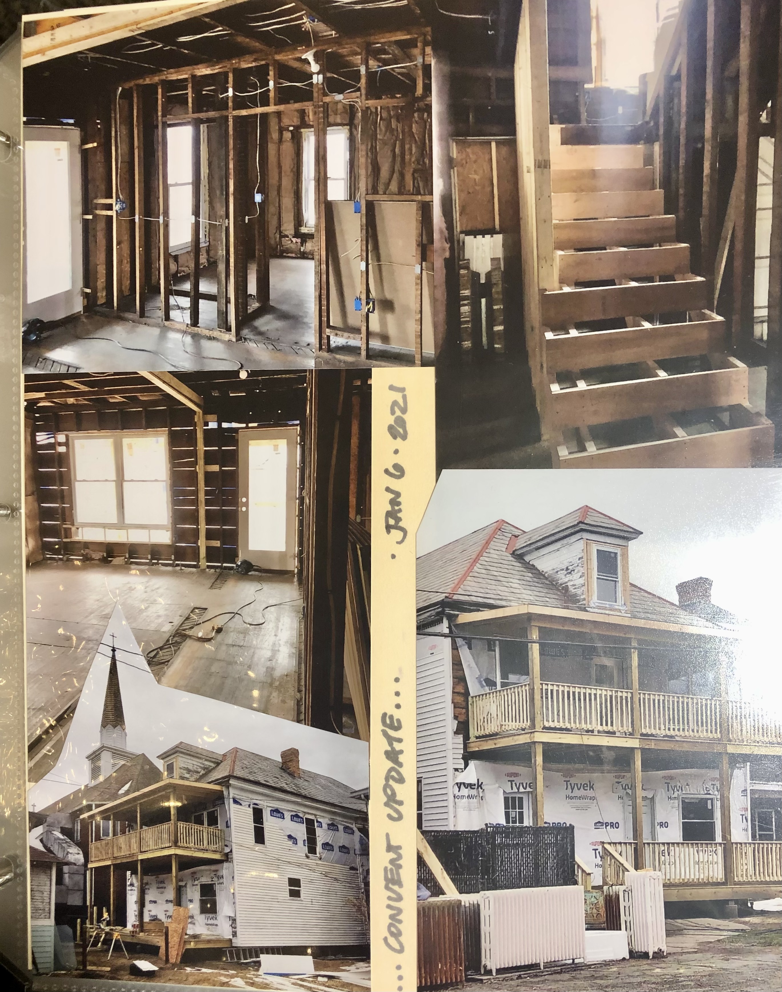 The convent was down to the studs, fresh electrical was being run and insulation started. Some bits of reframing (in hindsight, there should have been more. It should have been better work, too. I saw it and should have been a stronger advocate, but I was afraid of upsetting my contractor. I know. I am ashamed of myself.) There were newer windows. Tiny back stairs had been replaced with full sized risers. Treads were not yet in place. The back deck, once a genuine hazard, was rebuilt partly. Some fresh (or cleaned) siding was replaced after a layer of Tyvek encapsulated the old wood of the 1920s.