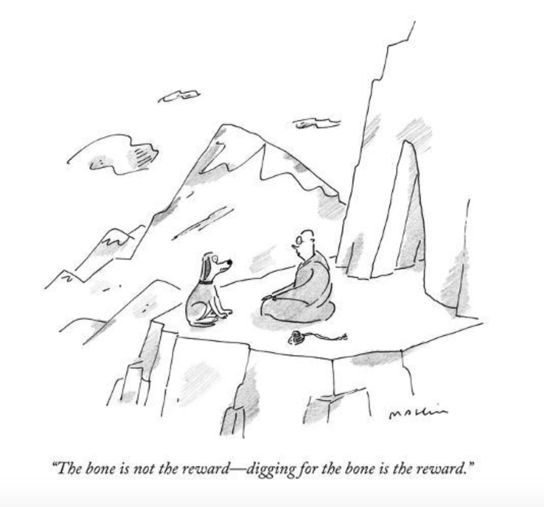 As the guru says to the dog, “the bone is not the reward—digging for the bone is the reward.” (Michael Maslin, New Yorker cartoon 6/23/14 – see below.)
