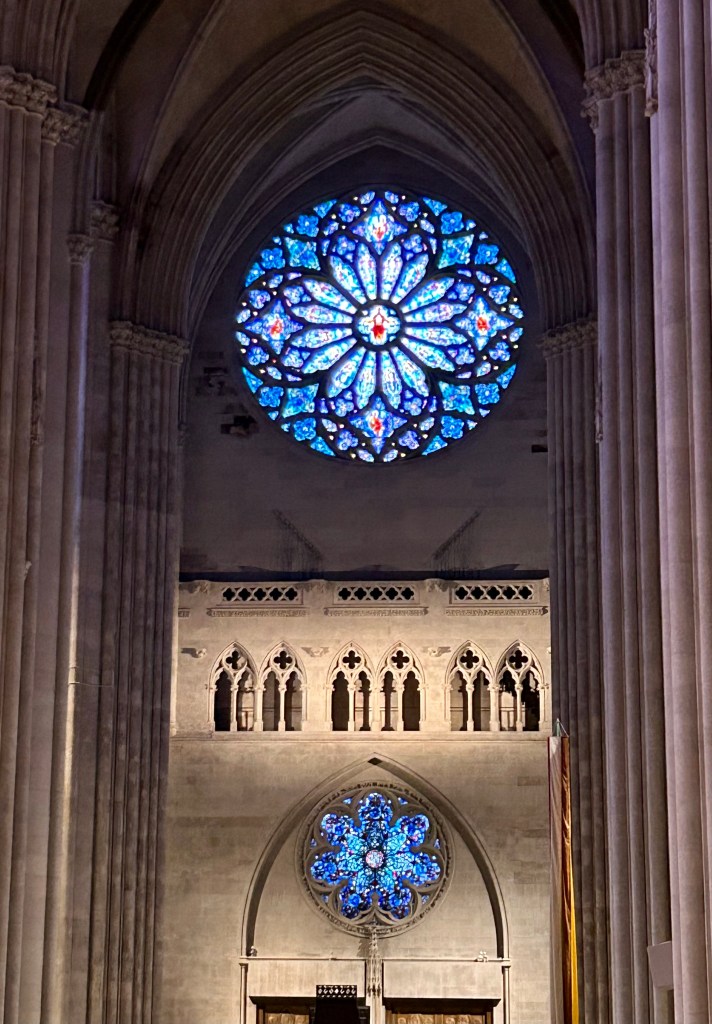 Impossible to see in any detail from where we stand, I learn later that it is the fourth largest rose window in the world (after Chartres at 46 feet and the two at Notre-Dame, both 43 feet). Built in 1932, it depicts key figures from Old and New Testaments, from Jesus at center, to the writers of the four gospels at the cardinal points (St John the northernmost), to Jeremiah, Ezekiel, Daniel and Isaiah at the intercardinal points, to winged figures with trumpets and thuribles, to seraphim representing divine love and cherubim, divine wisdom. Apparently the window seeks to represent the Bible itself, yet with light shining through 10,000 pieces of glass 75 feet above our heads, we only see the whole, the kaleidoscopic array, the effect of the creation. Which is perhaps something to ponder in its own right.