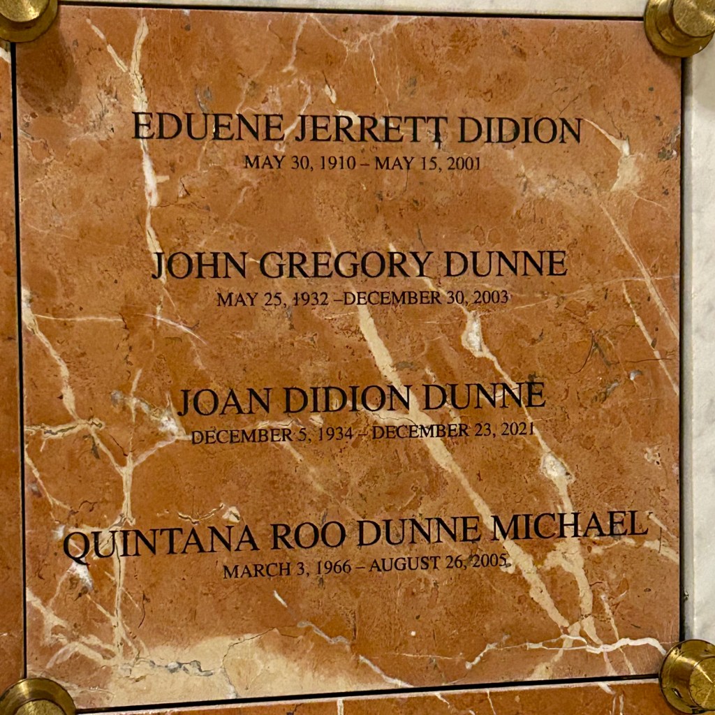 We walk into the many individual chapels, eventually finding the one where the Didion/Dunne family is laid to rest. My eyes sting. The Year of Magical Thinking floods back as does detailed memory of what I wrote a year prior. How John wrote on the question of service and how he complimented Joan on a sentence she wrote. Minor moments that still reach my heart. The life of two writers and their daughter who got sick and died while Joan was grieving her husband. The stuff of nightmares.