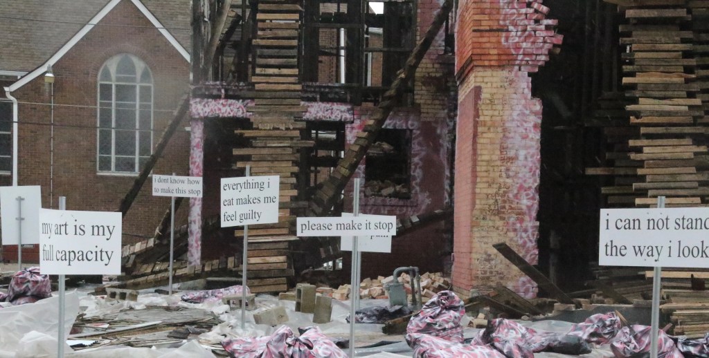 Six houses and one porch later, she has all of the materials she needs. She builds a lean-to and stores all of the wood she has collected, as her wheels begin to turn on how her piece will actualize. She follows an inner voice that is not always loving and kind. (We will see this in the signs.)
